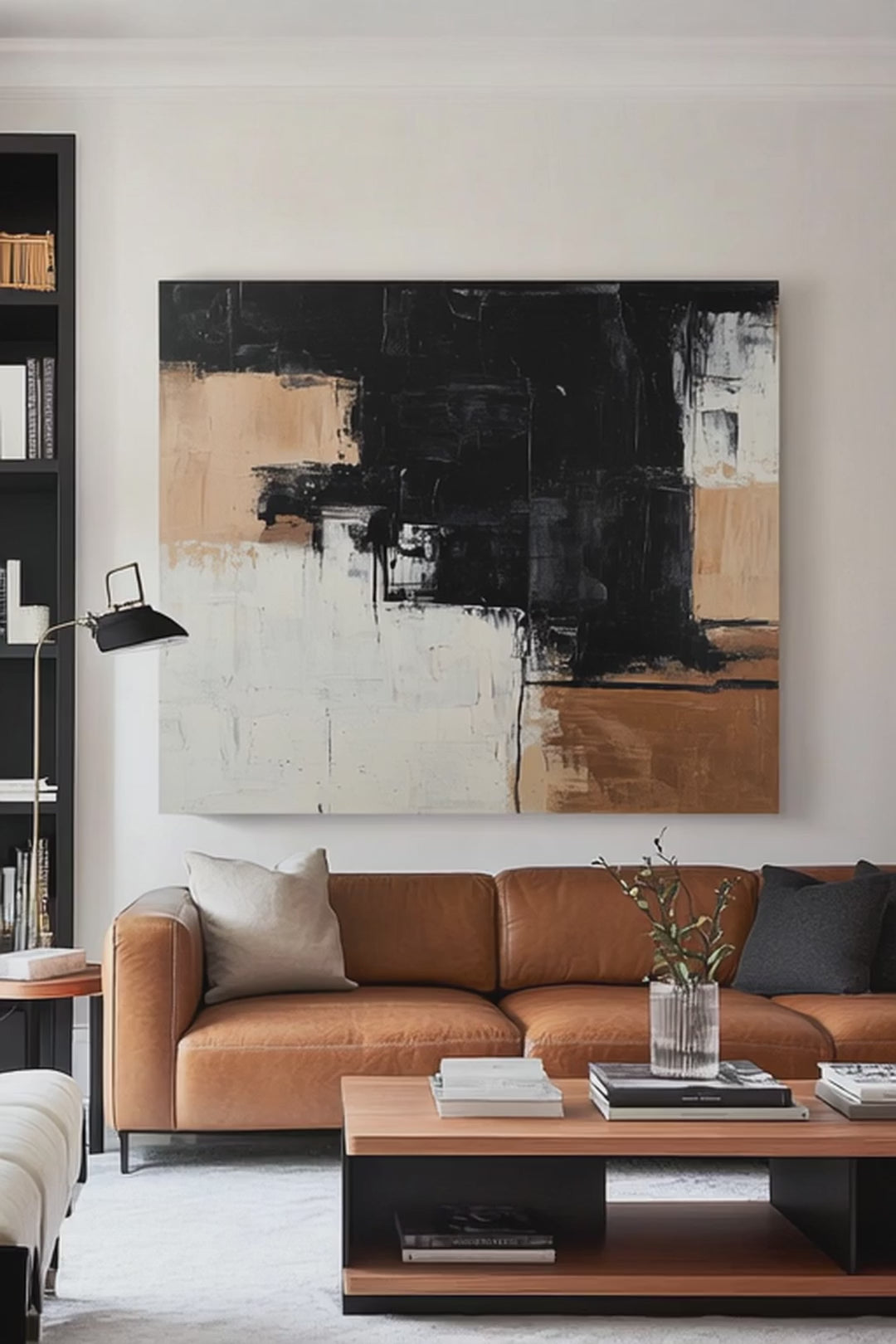 Urban Balance is an abstract painting that blends muted earth tones with deep black and texture like white to create a calm yet structured composition. The balance of warm beige and stark black evokes depth and contrast, giving the piece both serenity and strength.